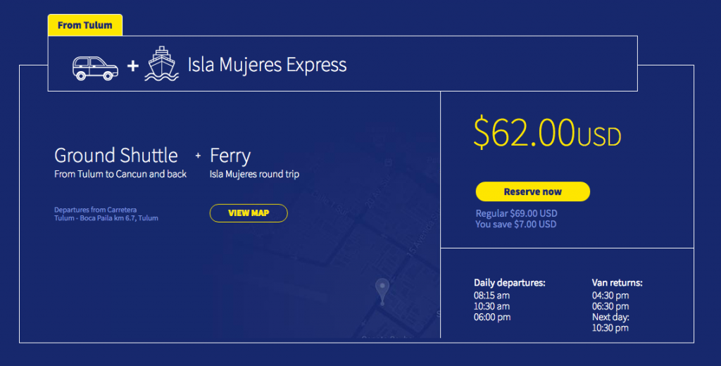 Ultramar is now offering a package, ground transportation from Tulum to the Isla Mujeres ferry plus ferry ticket. Check it out here